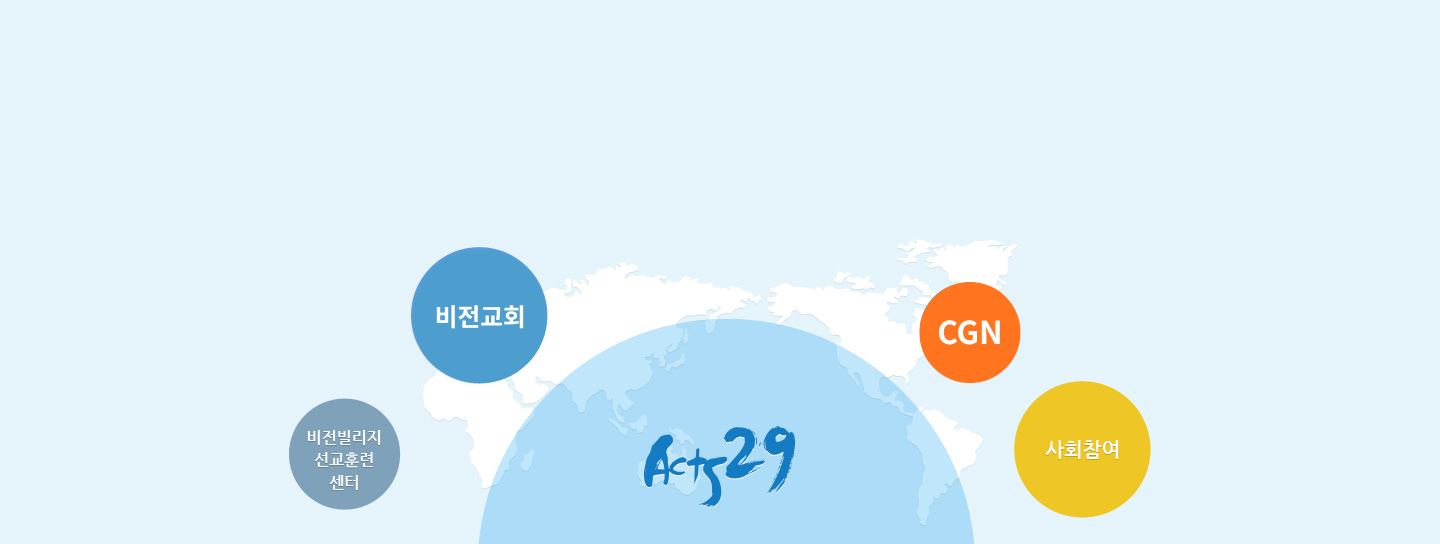 Acts29의 비전은 비전교회, CGN, 비전빌리지 선교훈련센터, 사회참여의 4가지 축으로 세분되어 수행되고 있습니다.